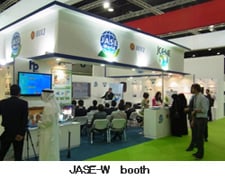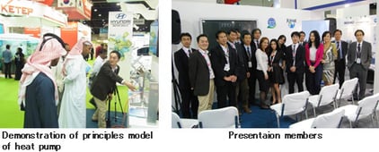 Exhibitors : 37 countries 400 companies We displayed panels which introduced public and private missions, exhibitions and the "Products & Technologies". In cooperations with Heat Pump & Thermal Storage Technology Center of Japan, they demonstrated the principle models in our booth and they are very popular. At the co-presentation corner with JCCME(Japan Cooperation Center for the Middle East) and NEDO(New Energy and Industry Technology Development Organization), JASE-W members have presented their technologies and products, and appealed Japan's advanced Energy efficiency.